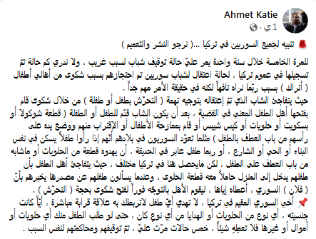 وتابع في منشوره قائلاً: “لكن مايحصل هنا في تركيا مختلف ، حيث يتفاجئ أهل الطفل بأن طفلهم يدخل إلى المنزل حاملاً معه قطعة الحلوى ، وعندما يسألون طفلهم عن مصدرها يخبرهم بأنّ ( فلان ) السوري ، أعطاه إياها ، ليقوم الأهل بالتوجّه فوراً لفتح شكوى بحجة ( التحرّش )”.